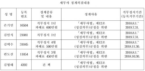 - ¼º½ÇÀǹ«±ÔÁ¤ ±ÔÁ¤À» À§¹ÝÇÑ ¼¼¹«»çµé¿¡°Ô Á÷¹«Á¤Áö µîÀÇ Â¡°èÁ¶Ä¡°¡ ³»·ÁÁ³´Ù. 29ÀÏ °üº¸¿¡ µû¸£¸é ±âȹÀçÁ¤ºÎ´Â Áö³ 22ÀÏ Á¦114Â÷ ¼¼¹«»ç¡°èÀ§¿øÈ¸¿¡¼ ¼¼¹«»ç¹ýÀ» À§¹ÝÇÑ 5¸íÀÇ ¼¼¹«..