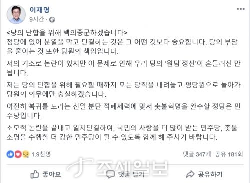 - ÀÌÀç¸í °æ±âÁö»ç´Â 11ÀÏ "Àú´Â ´çÀÇ ´ÜÇÕÀ» À§ÇØ ÇÊ¿äÇÒ ¶§±îÁö ¸ðµç ´çÁ÷À» ³»·Á³õ°í Æò´ç¿øÀ¸·Î µ¹¾Æ°¡ ´ç¿øÀÇ Àǹ«¿¡¸¸ Ãæ½ÇÇϰڽÀ´Ï´Ù"¶ó°í ´ç¹«À§¿øÁ÷ »çÅð Àǻ縦 ¹àÇû´Ù. ÀÌ Áö..