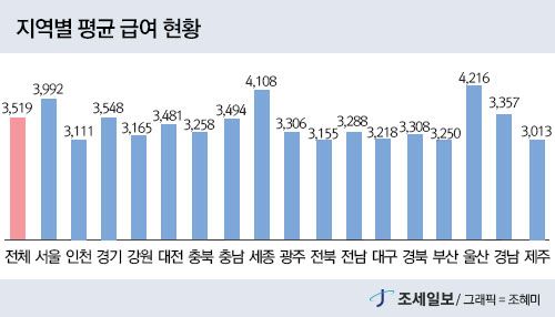 - Á÷ÀåÀεéÀÇ Æò±Õ ±Þ¿©¾×Àº ¿¬ 3519¸¸¿øÀ̾úÀ¸¸ç ±Þ¿©°¡ °¡Àå ³ôÀº Áö¿ªÀº ¿ï»ê, ¼¼Á¾, ¼¿ï ¼øÀ̾ú´Ù. ¹Ý¸é Á¦ÁÖ¿Í ÀÎõ, ÀüºÏÀº Àü±¹¿¡¼ ±Þ¿© ¼öÁØÀÌ ³·Àº Áö¿ªÀ̾ú´Ù. 27ÀÏ ±¹¼¼Ã»ÀÌ °ø..