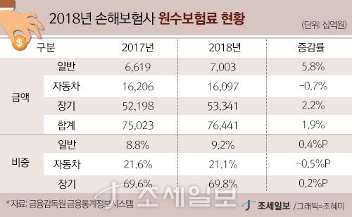 - 2018³â ±¹³» 11°³ ÀϹݼÕÇØº¸Çè»çµéÀÇ ¿ø¼öº¸Çè·á´Â 76.4Á¶¿ø ¼öÁØÀ¸·Î 2017³â¿¡ ºñÇØ ¾à 1.4Á¶¿ø °¡·® Áõ°¡ÇßÀ¸³ª, ¿ÜÇü¼ºÀåÀº Àü³â¿¡ ºñÇØ µÐȵƴÙ. <¿ë¾îÇØ¼³: ¿ø¼öº¸Çè·á´Â º¸Çèȸ»ç..