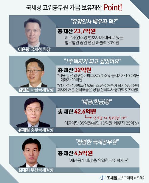 - ±¹¼¼Ã» 'ºò4'·Î ºÐ·ùµÇ´Â °íÀ§°ø¹«¿ø °¡±Þ(1±Þ) 4¸íÀÇ Àç»êº¸À¯¾×Àº ¾ó¸¶³ª µÉ±î. ÀÌÀºÇ× ±¹¼¼Ã» Â÷Àå, ±èÇöÁØ ¼¿ïÁö¹æ±¹¼¼Ã»Àå, À¯Àçö ÁߺÎÁö¹æ±¹¼¼Ã»Àå, ±è´ëÁö ºÎ»êÁö¹æ±¹¼¼Ã»Àå µî 1±Þ ..