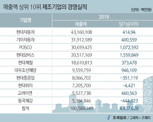 - Áö³ÇØ ¸ÅÃâ¾× »óÀ§ 10°³ ÁÖ¿ä Á¦Á¶¾÷ ¹ýÀεéÀº ÃÑ 180Á¶5844¾ï¿øÀÇ ¸ÅÃâÀ» ±â·ÏÇßÀ¸¸ç, À̵éÀÌ »ç¾÷º¸°í¼(2018³â ȸ°è»ç¾÷¿¬µµ ±âÁØ)¿¡ ¹Ý¿µÇÑ ¹ýÀμ¼¾×Àº 2Á¶¿øÀ» »óȸÇÏ´Â ¼öÁØÀ̾ú´ø °Í..