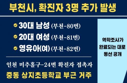 - ºÎõ½Ã¿¡¼ ½ÅÁ¾ Äڷγª¹ÙÀÌ·¯½º °¨¿°Áõ(Äڷγª19) È®ÁøÀÚ°¡ Ãß°¡·Î ¹ß»ýÇß´Ù. 21ÀÏ ºÎõ½Ã¿¡ µû¸£¸é À̳¯Áßµ¿ »óÁöÃʵîÇб³ ºÎ±Ù¿¡ °ÅÁÖÇÏ´Â 30´ë ³²¼º 1¸í, 20´ë ¿©¼º 1¸í, ¿µÀ¯¾Æ 1¸í µî ..