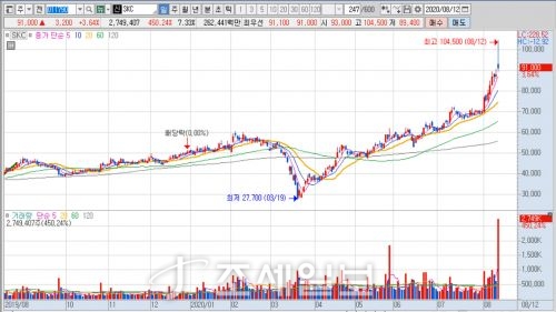 - SKCÀÇ ÁÖ°¡°¡ Áö³ÇØ ÀμöÇÑ µ¿¹Ú¾÷ü »ç¾÷ È¿°ú ±â´ë°¨¿¡ ÀÌ¾î ¹ÝµµÃ¼ Àåºñ¡¤ºÎǰ ¾÷üÀÎSKC¼Ö¹Í½º¸¦ 100% ÀÚȸ»ç·Î ÆíÀÔÇÑ´Ù´Â ¼Ò½Ä¿¡ ÀåÁß ÇѶ§ 52ÁÖ ½Å°í°¡¸¦ ±â·ÏÇÏ¸ç »ó½Â¼¼¸¦ ´Þ¸®°í ÀÖ..