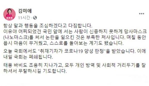 - ¸Á»çÇü ¸¶½ºÅ©¸¦ ¾²°í Á¤Àº°æ Á߾ӹ濪´ëÃ¥º»ºÎÀåÀ» ¸¸³µ´ø ¹Ì·¡ÅëÇÕ´ç ±è¹Ì¾Ö ÀÇ¿øÀÌ ÀÚ½ÅÀÇ À߸øÀ» ÀÎÁ¤Çß´Ù. ±è ÀÇ¿øÀº 26ÀÏ ÀÚ½ÅÀÇ ÆäÀ̽ººÏÀ» ÅëÇØ ¡°Ç×»ó ¸»°ú ÇൿÀ» Á¶½ÉÇÏ°Ú´Ù°í ´Ù..