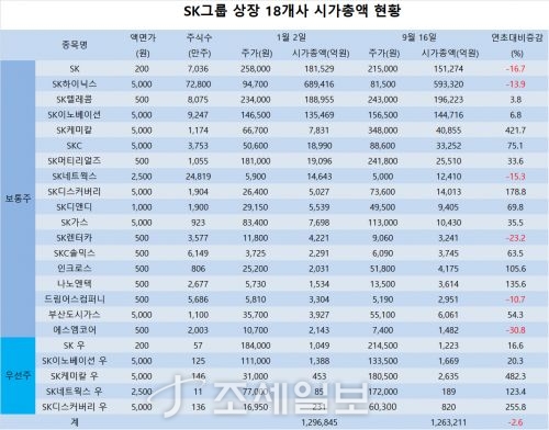 - SK±×·ìÀÇ »óÀå °è¿»ç ½Ã°¡ÃѾ×ÀÌ 16ÀÏ Á¾°¡ ±âÁØÀ¸·Î ÃÑ 126Á¶¿ø ±Ô¸ð¿¡ À̸£´Â °ÍÀ¸·Î ³ªÅ¸³µ½À´Ï´Ù.SK±×·ìÀº »ï¼º±×·ì°ú Çö´ëÂ÷±×·ìÀÌ ¿¬Ãʺ¸´Ù 13% Á¤µµ ½Ã°¡ÃѾ×ÀÌ ´Ã¾î³ °Í°ú ¹Ý´ë·Î ½Ã..