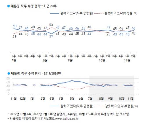 - Ùþ´ëÅë·É ÁöÁöÀ², 3%p »ó½ÂÇÑ 46%...ºÎÁ¤Æò°¡ 45%2020.11.13 11:58