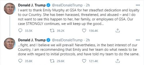 - ¿Ü½Å¿¡ µû¸£¸é 23ÀÏ(ÇöÁö½Ã°£) ¿ÀÈÄ ¹Ì ¿¬¹æÁ¶´Þû(GSA)ÀÌ ¹ÙÀÌµç ´ç¼±ÀÎ ÃøÀÇ ½Â¸®¸¦ °ø½Ä ÀÎÁ¤Çϸç Á¤±Ç Àμö ÀýÂ÷ °³½Ã¸¦ Å뺸Çß´Ù. À̳¯ Æ®·³ÇÁ ´ëÅë·É ¶ÇÇÑ Æ®À§ÅÍ¿¡ "¿¬¹æÁ¶´Þû°ú ÀÚ½ÅÀÇ..