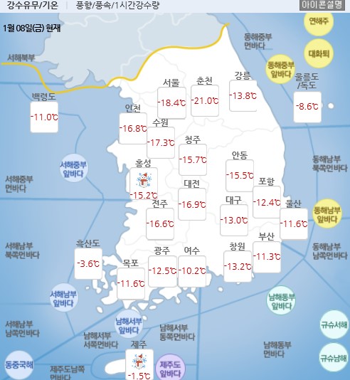 - ±â»óûÀº 9ÀÏ(Åä) Àü±¹¿¡ °ÃßÀ§°¡ °è¼ÓµÇ¸é¼ Àü±¹ÀÌ ´ëü·Î ¸¼°ÚÁö¸¸ Àü¶ó ¼ÇؾȰú Á¦ÁÖµµ¸¦ Áß½ÉÀ¸·Î ´«ÀÌ ³»·Á ¸ð·¹±îÁö À̾îÁö°Ú´Ù°í ¿¹º¸Çß´Ù. 9ÀÏÀü±¹ ¾ÆÄ§ ÃÖÀú±â¿ÂÀº –24¿¡..