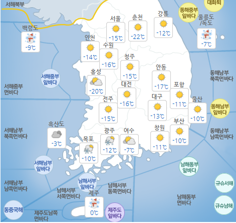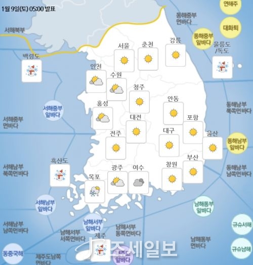 - ±â»óûÀº 9ÀÏ(Åä) Àü±¹¿¡ °ÃßÀ§°¡ °è¼ÓµÇ¸é¼ Àü±¹ÀÌ ´ëü·Î ¸¼°ÚÁö¸¸ Àü¶ó ¼ÇؾȰú Á¦ÁÖµµ¸¦ Áß½ÉÀ¸·Î ´«ÀÌ ³»·Á ¸ð·¹±îÁö À̾îÁö°Ú´Ù°í ¿¹º¸Çß´Ù. 9ÀÏÀü±¹ ¾ÆÄ§ ÃÖÀú±â¿ÂÀº –24¿¡..