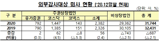 - ½Å(ãæ)¿ÜºÎ°¨»ç¹ý ½ÃÇàÀ¸·Î ÀÎÇØ ¿ÜºÎ°¨»ç´ë»ó ȸ»ç´Â °¨¼ÒÇßÁö¸¸, °¨»çÀÎÀÌ ÁöÁ¤µÈ ȸ»ç´Â ´Ã¾î³ °ÍÀ¸·Î ³ªÅ¸³µ´Ù. 26ÀÏ ±ÝÀ¶°¨µ¶¿ø¿¡ µû¸£¸é 2020³â¸» ÇöÀç ¿ÜºÎ°¨»ç´ë»ó ȸ»ç´Â 3¸¸1..