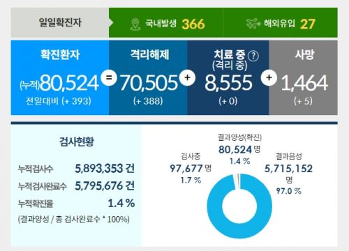 • ±¹³» ½ÅÁ¾ Äڷγª¹ÙÀÌ·¯½º °¨¿°Áõ(Äڷγª19) ½Å±Ô È®ÁøÀÚ°¡ 393¸í ¹ß»ýÇß´Ù. 6ÀÏ Áúº´°ü¸®Ã» Á߾ӹ濪´ëÃ¥º»ºÎ´Â "À̳¯ 0½Ã ±âÁØÀ¸·Î ±¹³» ¹ß»ý ½Å±Ô È®ÁøÀÚ´Â 366¸í, ÇØ¿ÜÀ¯ÀÔ »ç·Ê´Â 27..