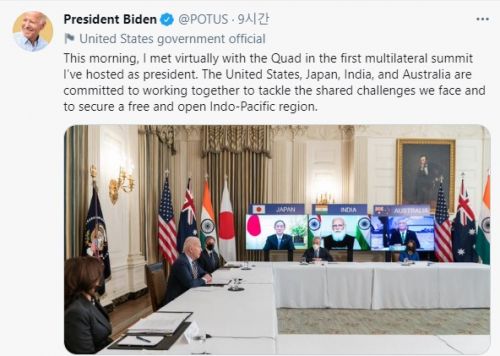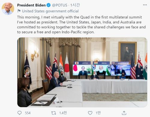 - ¹Ì±¹, ÀϺ», Àεµ, È£ÁÖÀÇ ÇùÀÇüÀÎ 'Äõµå(Quad)' 4°³±¹ Á¤»óÀÌ ºÏÇÑÀÇ ¿ÏÀüÇÑ ºñÇÙȸ¦ ´ÙÁüÇß´Ù°í ¡´¹Ì±¹ÀǼҸ®(VOA)¡µ ¹æ¼ÛÀÌ 13ÀÏ ÀüÇß´Ù. VOA º¸µµ¿¡ µû¸£¸é, ¹é¾Ç°üÀº 12ÀÏ(ÇöÁö½Ã°£) ..
