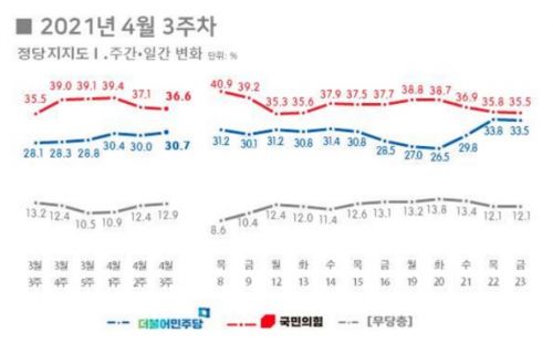 - '±¹Èû 36.6% vs ¹ÎÁÖ 30.7%'...4.7À纸¼± ±¹¸é À¯Áö2021.04.26 08:58
