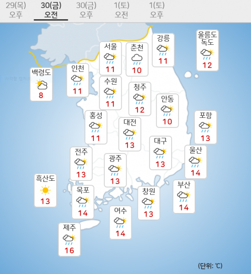 - ¼Çػ󿡼 ´Ù°¡¿À´Â ±â¾Ð°ñ ¿µÇâÀ¸·Î ¸ñ¿äÀÏ(29ÀÏ) ¹ã(18~24½Ã) ¼ÂÊÁö¿ªºÎÅÍ ºñ°¡ ½ÃÀÛµÇ¾î ±Ý¿äÀÏ(30ÀÏ) »õº®(00~06½Ã)¿¡´Â Àü±¹À¸·Î È®´ëµÈ ÈÄ ±Ý¿äÀÏ ¿ÀÀü(06~12½Ã)¿¡ ´ëºÎºÐ ±×Ä¡°ÚÀ¸..