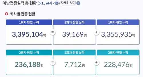 - Àü ±¹¹ÎÀÇ ¾à 6.6%ÀÎ 339¸¸¿©¸íÀÌ ½ÅÁ¾ Äڷγª¹ÙÀÌ·¯½º °¨¿°Áõ(Äڷγª19) ¹é½Å 1Â÷ ¿¹¹æÁ¢Á¾À» ¸¶ÃÆ´Ù. 2Â÷ ¿¹¹æÁ¢Á¾ ¿Ï·áÀÚµµ 23¸¸¸íÀ» ³Ñ¾î¼¹´Ù.2ÀÏ Äڷγª19 ¿¹¹æÁ¢Á¾´ëÀÀÃßÁø´Ü¿¡ µû¸£¸é Àü..