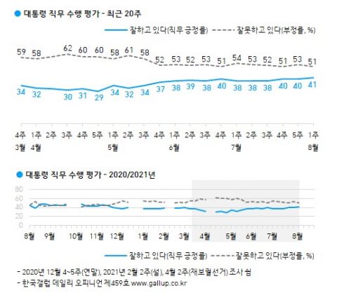 - Ùþ´ëÅë·É ÁöÁöÀ² 41%...3ÁÖ ¿¬¼Ó 40%´ë À¯Áö2021.08.06 13:02