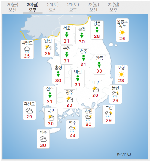 - ¿À´Ã(20ÀÏ ±Ý) ¹ã(21~24½Ã) Àü³²³²ÇؾȰú °æ³²±Ç, Á¦ÁÖµµºÎÅÍ ºñ°¡ ½ÃÀÛµÇ¾î ³»ÀÏ(21ÀÏ Åä) »õº®(00~06½Ã)¿¡ ±× ¹ÛÀÇ ³²ºÎÁö¹æ°ú ÁßºÎ¼ÇØ¾È, ¿ÀÀü(06~12½Ã)¿¡ Àü±¹ ´ëºÎºÐ Áö¿ªÀ¸·Î È®´ëµÇ..