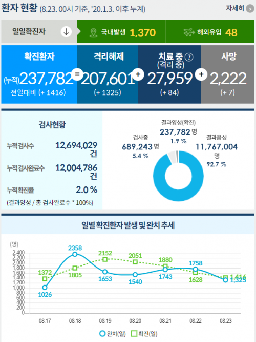 - ¢Â ½Å±Ô È®ÁøÀÚ ±¹³» 1,370¸í, ÇØ¿ÜÀ¯ÀÔ 48¸í Á߾ӹ濪´ëÃ¥º»ºÎ(º»ºÎÀå: Á¤Àº°æ ûÀå)´Â 8¿ù 23ÀÏ 0½Ã ±âÁØÀ¸·Î, ±¹³» ¹ß»ý ½Å±Ô È®ÁøÀÚ´Â 1,370¸í, ÇØ¿ÜÀ¯ÀÔ »ç·Ê´Â 48¸íÀÌ È®ÀεǾî ÃÑ..