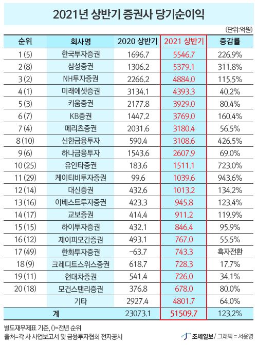 - ¿ÃÇØ »ó¹Ý±â 52°³ Áõ±Çȸ»ç ¼øÀÌÀÍÀÌ 5Á¶¿øÀ» µ¹ÆÄÇß´Ù. Áö³ÇØ »ó¹Ý±â 5À§¿´´ø Çѱ¹ÅõÀÚÁõ±ÇÀÌ ¼±µÎ¿¡ ¿À¸£°í 1À§¿´´ø ¹Ì·¡¿¡¼ÂÁõ±ÇÀÌ 4À§·Î ¹Ð·Á³µ´Ù. »óÀ§ 20°³»ç Áß 8°³»ç°¡ Àüü Æò±Õ(..