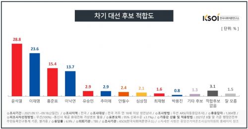 • ÀÌÀç¸í 27.8%,À±¼®¿­ 18.8%, È«ÁØÇ¥ 14.8%, À̳«¿¬ 12.0%2021.09.21 11:28