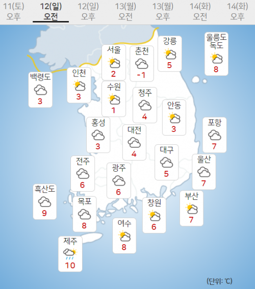 - ÀÏ¿äÀÏÀÎ 12ÀÏ, Àü±¹ÀÌ °¡²û ±¸¸§¸¹´Ù°¡ ³·ºÎÅÍ Â÷Â÷ ¸¼¾ÆÁö°ÚÀ¸³ª, Àü¶ó±Ç°ú Á¦ÁÖµµ´Â ´ëü·Î È帮°Ú½À´Ï´Ù. ¾ÆÄ§ÃÖÀú±â¿ÂÀº -2~8µµ, ³·ÃÖ°í±â¿ÂÀº 3~14µµ°¡ µÇ°Ú½À´Ï´Ù. ³·ºÎÅÍ ºÏ..