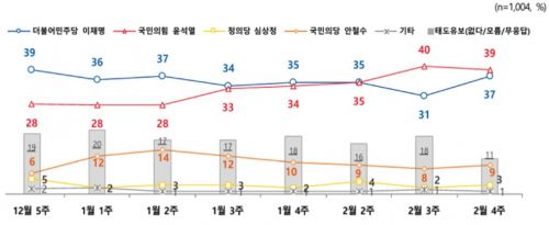 • [Çѱ¹°¶·´] À±¼®¿­ 39%, ÀÌÀç¸í 38.3%...0.7%P °ÝÂ÷ ÃÊÁ¢Àü2022.02.23 18:02