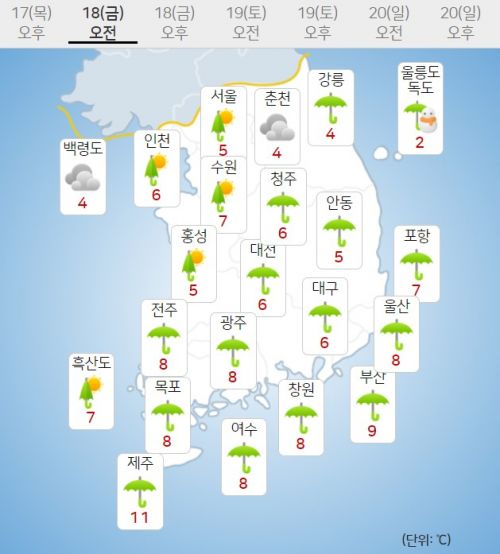 - ±Ý¿äÀÏÀÎ 18ÀÏ, Àü±¹ÀÌ ´ëü·Î È帮°í ¿ÀÀü±îÁö ºñ³ª ´«ÀÌ ³»¸®°Ú½À´Ï´Ù. Àü³¯ºÎÅÍ ½ÃÀÛµÈ ºñ¿Í ´«Àº ¿ÀÀü¿¡ ´ëºÎºÐ ±×Ä¡°ÚÀ¸³ª, Á¦ÁÖµµ´Â ¿ÀÈıîÁö À̾îÁö°Ú½À´Ï´Ù. ÁÖ¸»¿¡´Â ¶Ç´Ù½Ã..