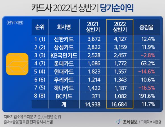 - ¿ÃÇØ »ó¹Ý±â Ä«µå»çµéÀº °¡¸ÍÁ¡ ¼ö¼ö·á ÀÎÇÏ¿Í ±Ý¸®»ó½Â ¿©ÆÄ¿¡µµ ¼øÀÌÀÍÀÌ 11.7% Áõ°¡ÇÏ¸ç ¼±¹æÇÑ °ÍÀ¸·Î ³ªÅ¸³µ´Ù. ƯÈ÷ ·Ôµ¥Ä«µå´Â Çö´ëÄ«µå¸¦ Á¦Ä¡°í 9³â ¸¸¿¡ ¾÷°è 4À§¿¡ ¿Ã¶ó ´«±æÀ» ..