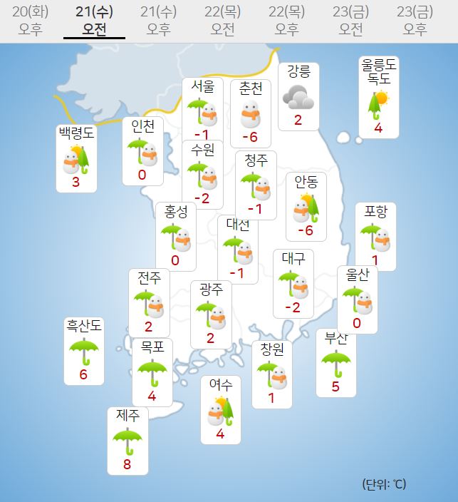 - ¼ö¿äÀÏÀÎ 21ÀÏ, Àü±¹ ´ëºÎºÐ Áö¿ª¿¡ »õº®ºÎÅÍ ´« ¶Ç´Â ºñ°¡ ³»¸®°Ú½À´Ï´Ù. ´«·ºñ´Â ´ÊÀº ¿ÀÈĺÎÅÍ Àú³á »çÀÌ ´ëºÎºÐ ±×Ä¡°ÚÀ¸³ª, °¿ø³»·ú·»êÁö¿Í ÃæÃ»±Ç, ÀüºÏ, Àü³²ºÏºÎ..