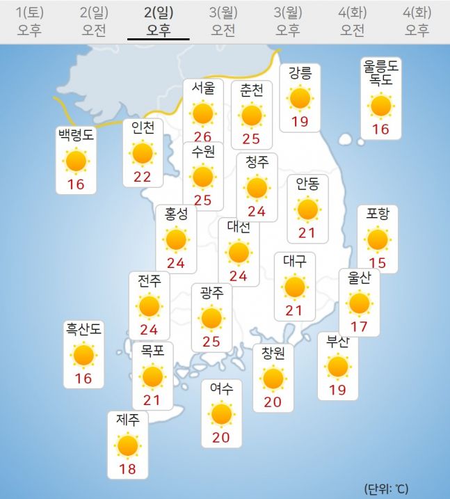 • ÀÏ¿äÀÏÀÎ 2ÀÏ, Àü±¹ÀÌ ´ëü·Î ¸¼°Ú½À´Ï´Ù. ¾ÆÄ§ÃÖÀú±â¿ÂÀº 3~11µµ, ³·ÃÖ°í±â¿ÂÀº 15~26µµ°¡ µÇ°Ú½À´Ï´Ù. ´çºÐ°£ Àü±¹ ´ëºÎºÐ Áö¿ªÀÇ ³· ±â¿ÂÀÌ 20µµ ÀÌ»ó ¿À¸£°Ú°í, ƯÈ÷ ¼öµµ±ÇÀ» Áß..
