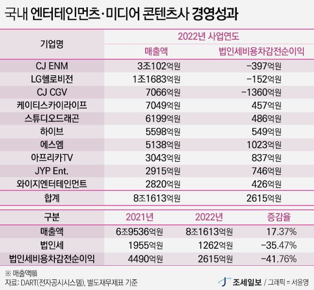 - Áö³ÇØ(2022³â ±Í¼Ó) 10°³ ¿£ÅÍÅ×ÀÎ¸ÕÆ®·¹Ìµð¾î ÄÜÅÙÃ÷»ç°¡ °ø½ÃÇÑ ¹ýÀμ¼°¡ Àü³â ´ëºñ 35% °¨¼ÒÇÑ 1262¾ï¿øÀ» ±â·ÏÇß´Ù. ¸ÅÃâ »óÀ§ 10À§ ¿£ÅÍ»ç °¡¿îµ¥ ¿¡½º¿¥ÀÌ ¹ýÀμ¼ 1À§¿¡ ¿Ã¶ú´Ù. ..