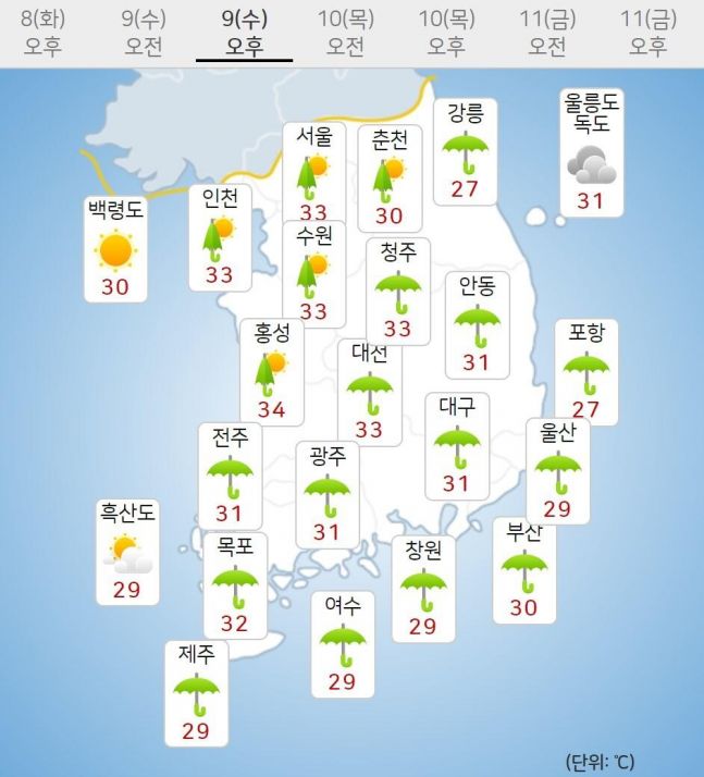 - ¼ö¿äÀÏÀÎ 9ÀÏ, Àü±¹ÀÌ ´ëü·Î È帮°Ú½À´Ï´Ù. °¿ø¿µµ¿°ú °æ»óµ¿ÇؾÈ, Á¦ÁÖµµ¿¡ ºñ°¡ ³»¸®°Ú°í, ¿ÀÀü¿¡ Àü³²³²ÇؾȰú °æ³²±Ç, ¿ÀÈÄ¿¡´Â ÃæÃ»±Ç°ú ±× ¹ÛÀÇ ³²ºÎÁö¹æ, ¹ã¿¡´Â ±× ¹ÛÀÇ Àü±¹..